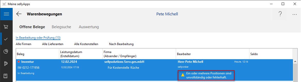 Der zuletzt erzeugte Beleg enthält bereits in dieser Belegübersicht eine Meldung bzw. Icon