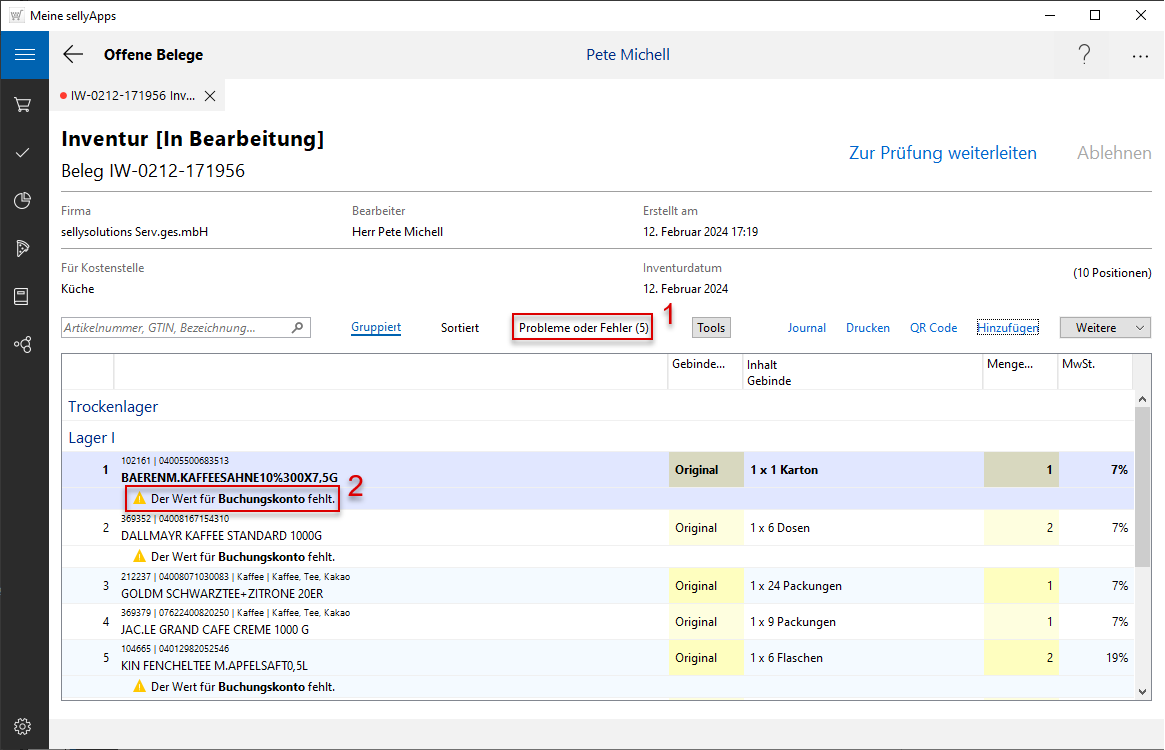Die fehlerbehafteten Positionen werden zusätzlich in der Liste Probleme oder Fehler zusammengefasst und in der Klammer die Fehleranzahl angezeigt (s. Markierung 1).