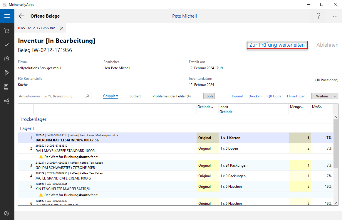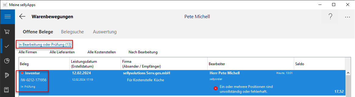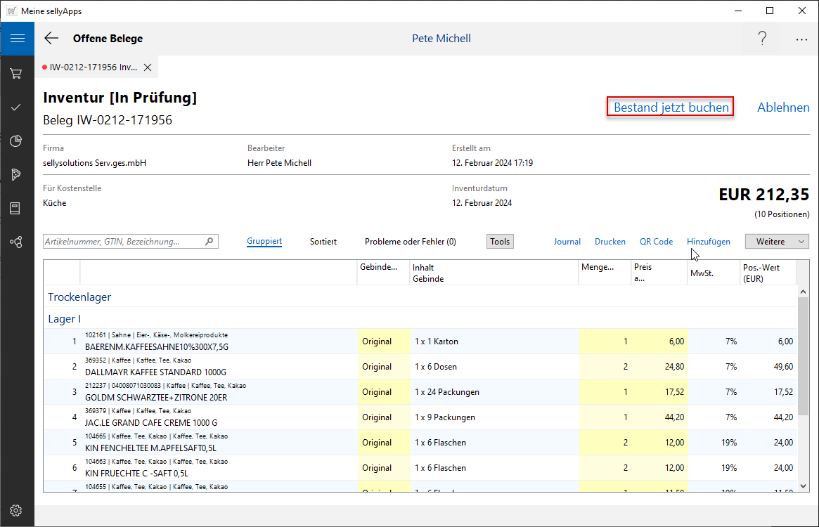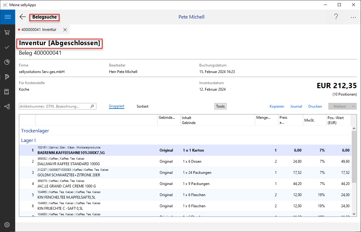 (s. l. Markierung) öffnen Sie den Inventurbeleg und sehen, dass dieser jetzt im Status Abgeschlossen