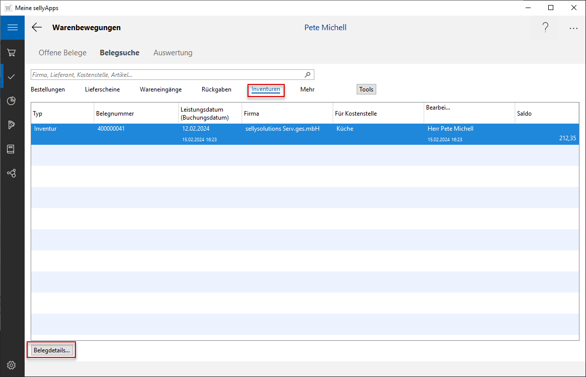 Inventuren ist jetzt der Beleg zu finden. Da dieser der aktuellste Beleg ist, steht er an erster Position in der Ansicht