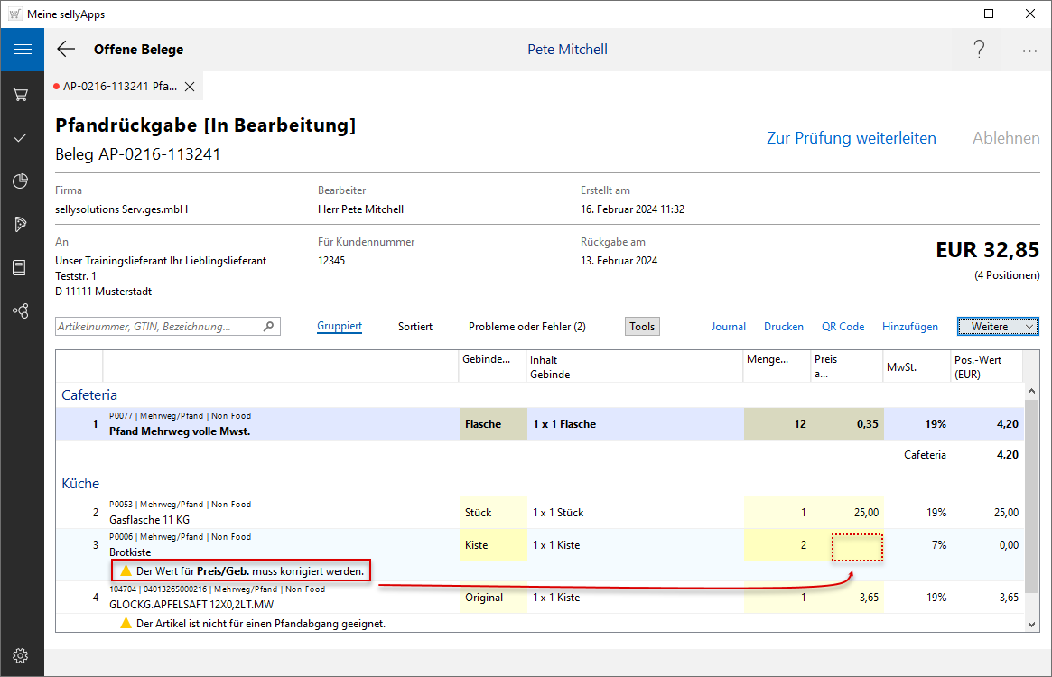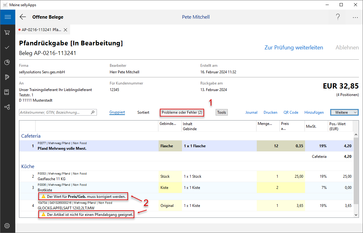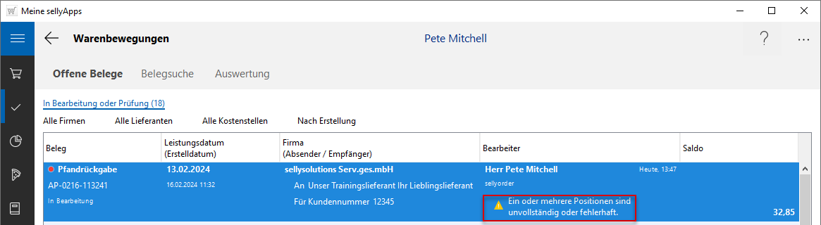 Der zuletzt erzeugte Pfandrückgabebeleg enthält bereits in dieser Belegübersicht einen Hinweis (s. Markierung), dass er mindestens eine Position enthält, die