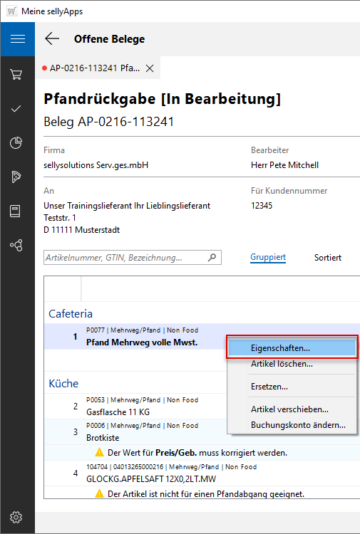 Das Entfernen einer Belegposition aus dem Beleg erfolgt ebenfalls über das rechte Mausmenü (s. a. Kontextmenü).