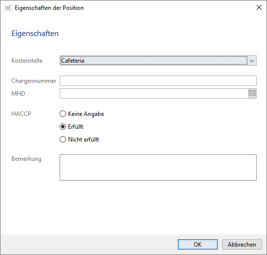 Bei Fehlern hinsichtlich Positionseigenschaften, wie die Kostenstelle, nehmen Sie die Nachpflege im Dialog Eigenschaften der Position (s. Bild rechts) vor, welchen Sie über die rechte Maustaste oder nach Doppelklick auf die Zeile erhalten.