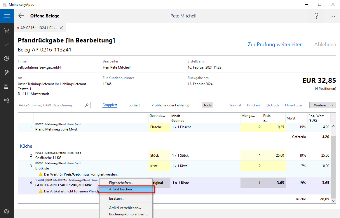 In den sellyApps, können Sie, nach Aufruf der Belegdetails, Positionen aus Ihrem