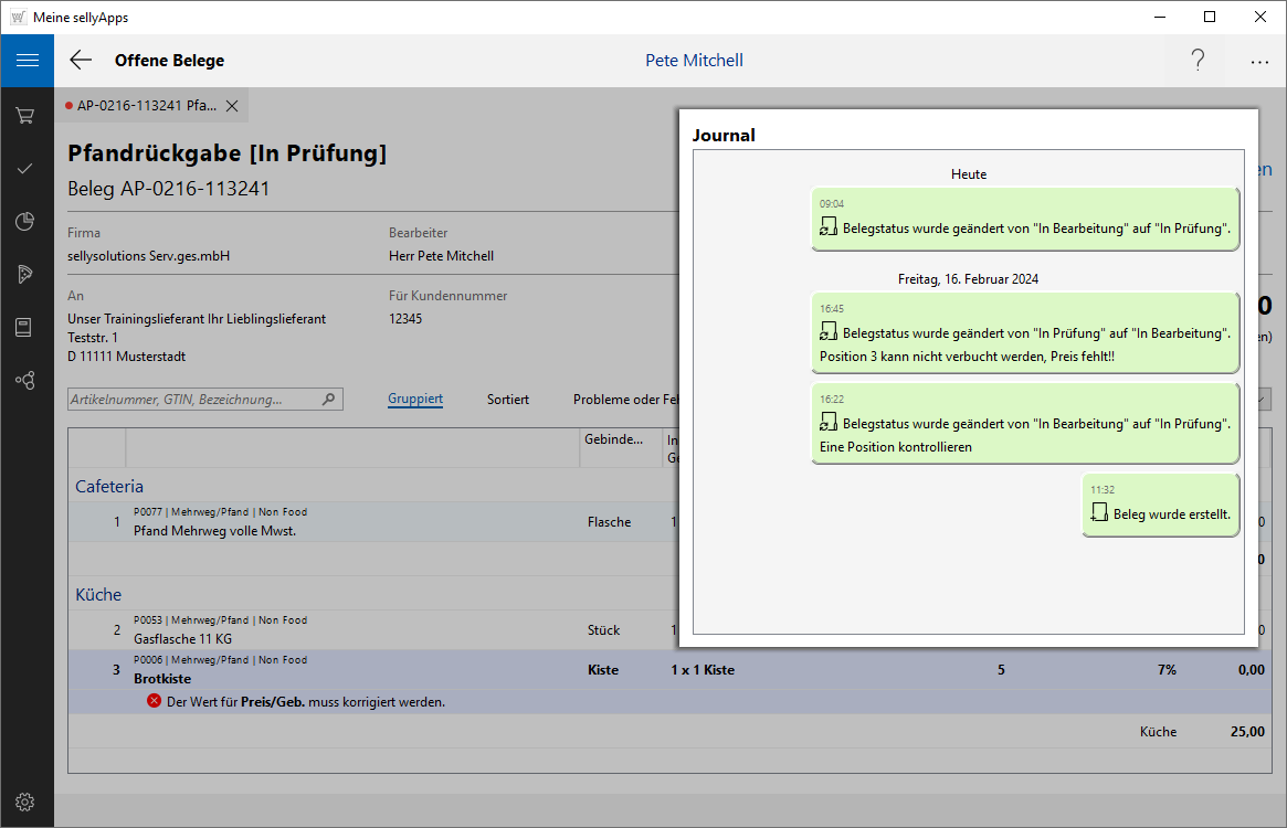 Es werden jeweils die Belegübergänge von Bearbeitung zur Prüfung, von Prüfung zur Bestätigung und letztendlich von der Bestätigung zum Abschluss dokumentiert.