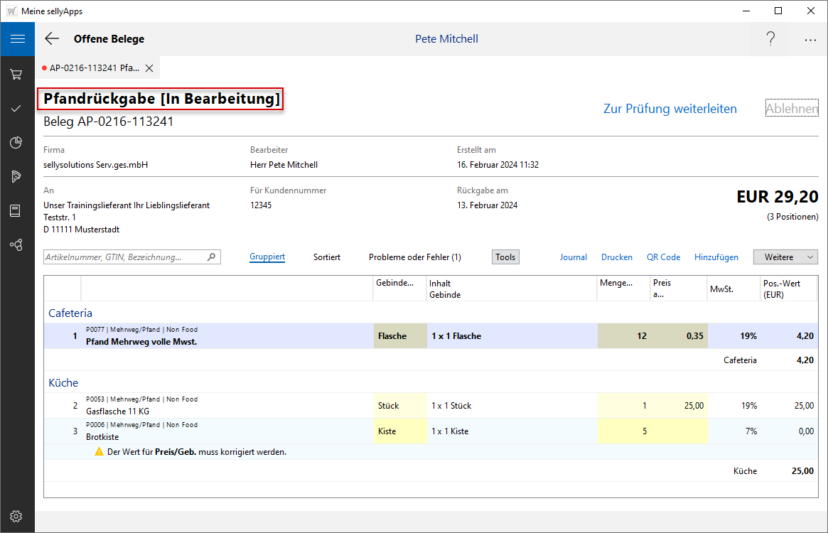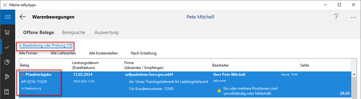 Der Beleg ist wieder mit dem Status In Bearbeitung gekennzeichnet.