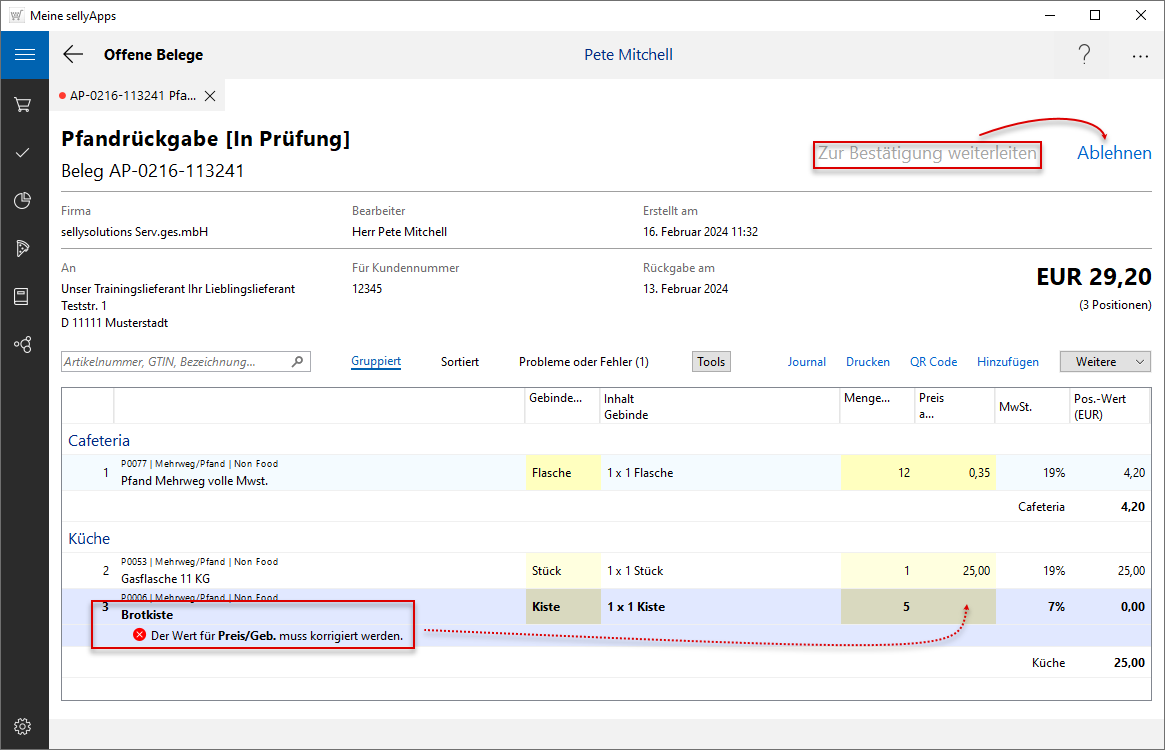 Ist der Beleg nicht in allen Positionen korrekt, können Sie diesen