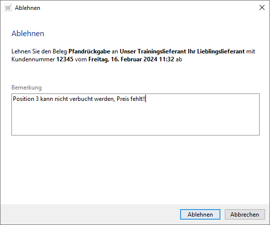 Erfolgt das Ablehnen muss im nachfolgenden Dialog eine Bemerkung angegeben werden.