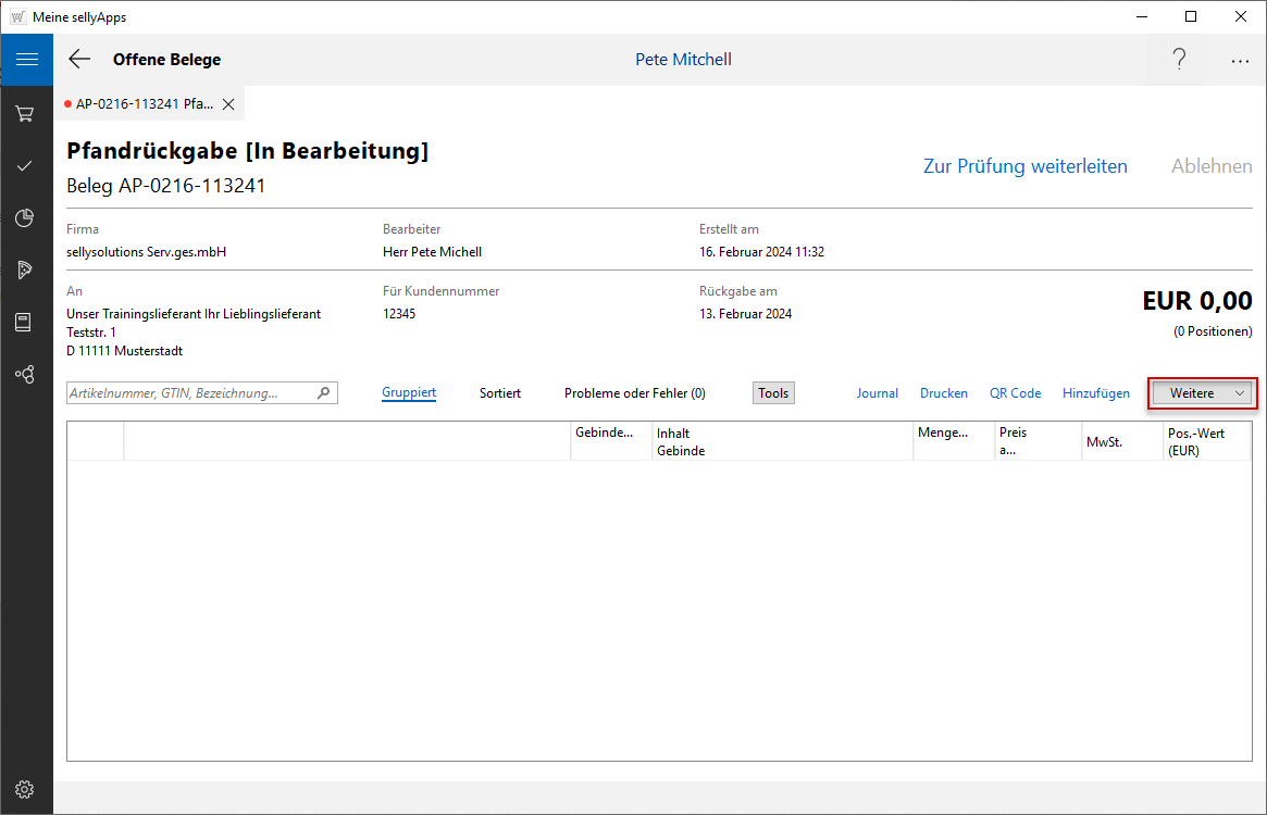 Im nächsten Schritt wählen Sie den oder die Pfandartikel, den bzw. die Sie an Ihren Lieferanten zurückgeben möchten, mittels Schaltfläche [Weitere] (s. o. Markierung im Bild links) für Ihren Beleg aus.