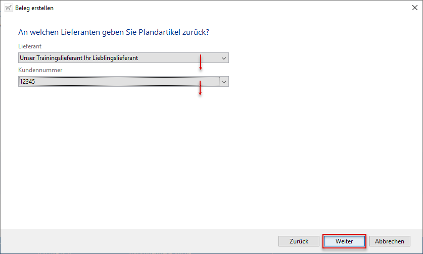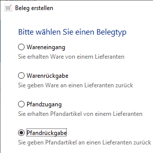 Nach dem ersten Schritt, dem Klick auf [Neu...] in der Belegübersicht, wählen Sie den Belegtyp Pfandrückgabe und wechseln zum nächsten Schritt mittels Schaltfläche [Weiter].