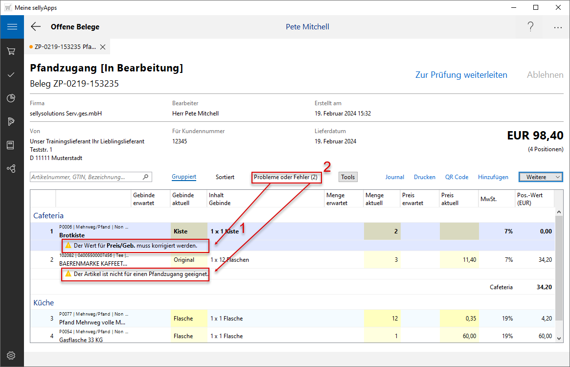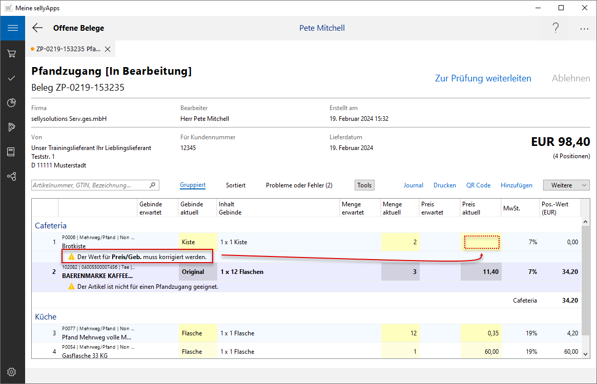 Dieser Beleg hat vier Positionen, wovon zwei Positionen einen Fehlerhinweis haben. Der Artikel Brotkiste hat keine Preisangabe (s. Markierung 1), diese kann direkt in die Spalte Preis aktuell, im gelben Feld nachgetragen werden.