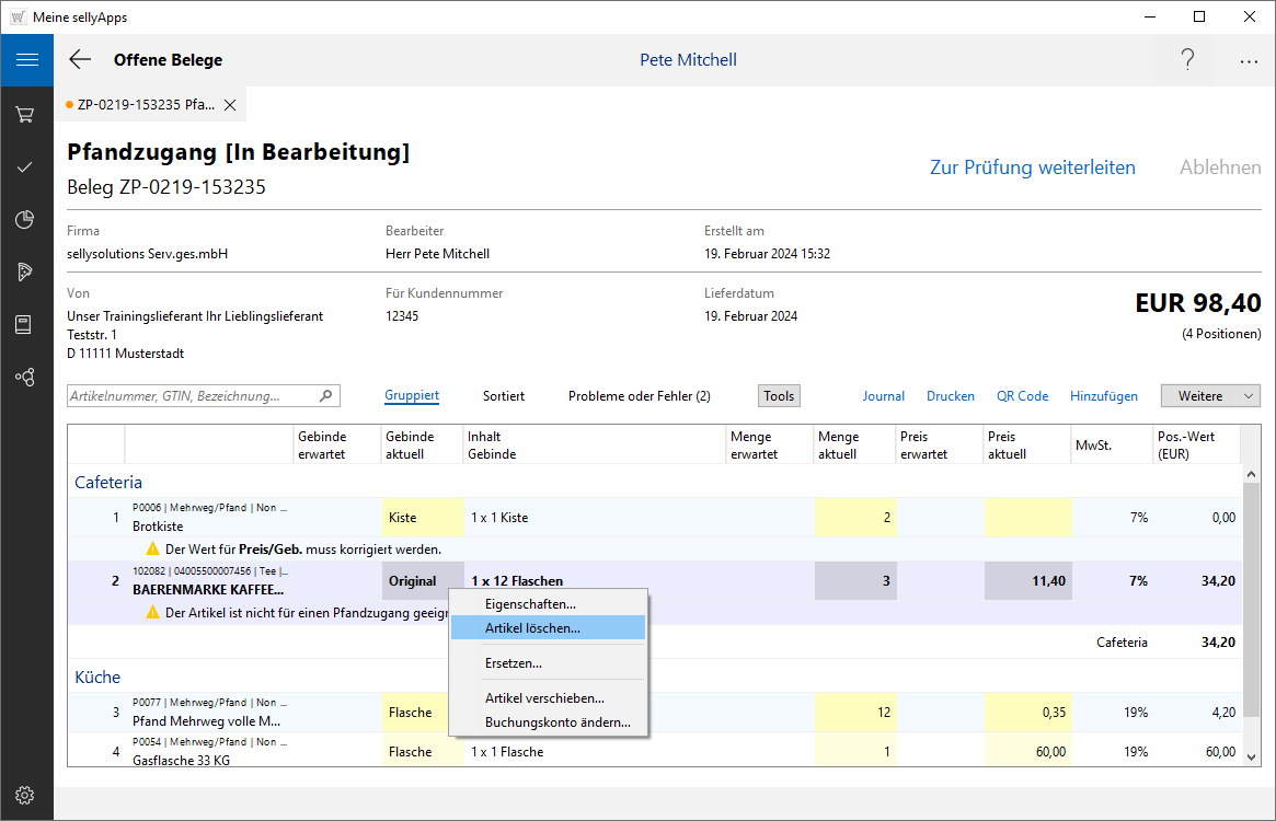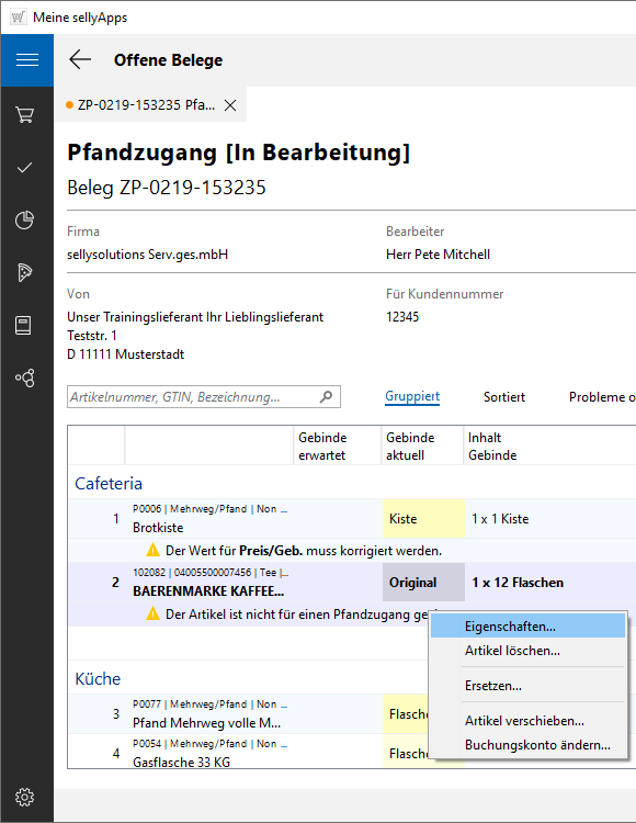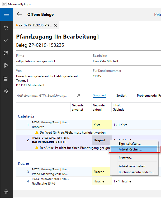 Haben Sie einen Artikel in Ihren Pfandzugangsbeleg übernommen, der nicht zu einem Pfandsortiment gehört und somit kein Pfandartikel ist, muss dieser aus dem Beleg entfernt werden.