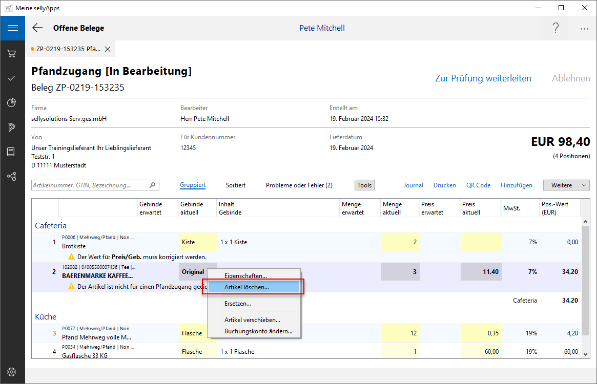 Handelt es sich in einem Pfandbeleg um einen Nicht-Pfandartikel, muss dieser gelöscht werden, bevor ein nächster Buchungsschritt (z. B. zur Prüfung weiterleiten) möglich ist.