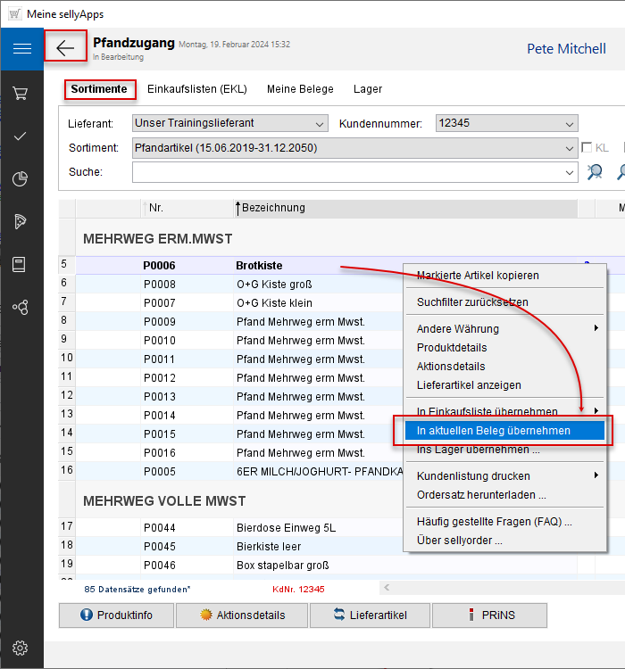 in der Ansicht der Belegdetails und Anwahl des Menüpunktes Pfandartikel hinzufügen..., wechseln Sie automatisch zu Ihren