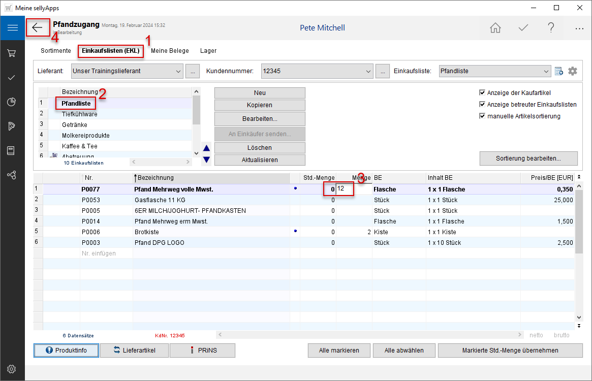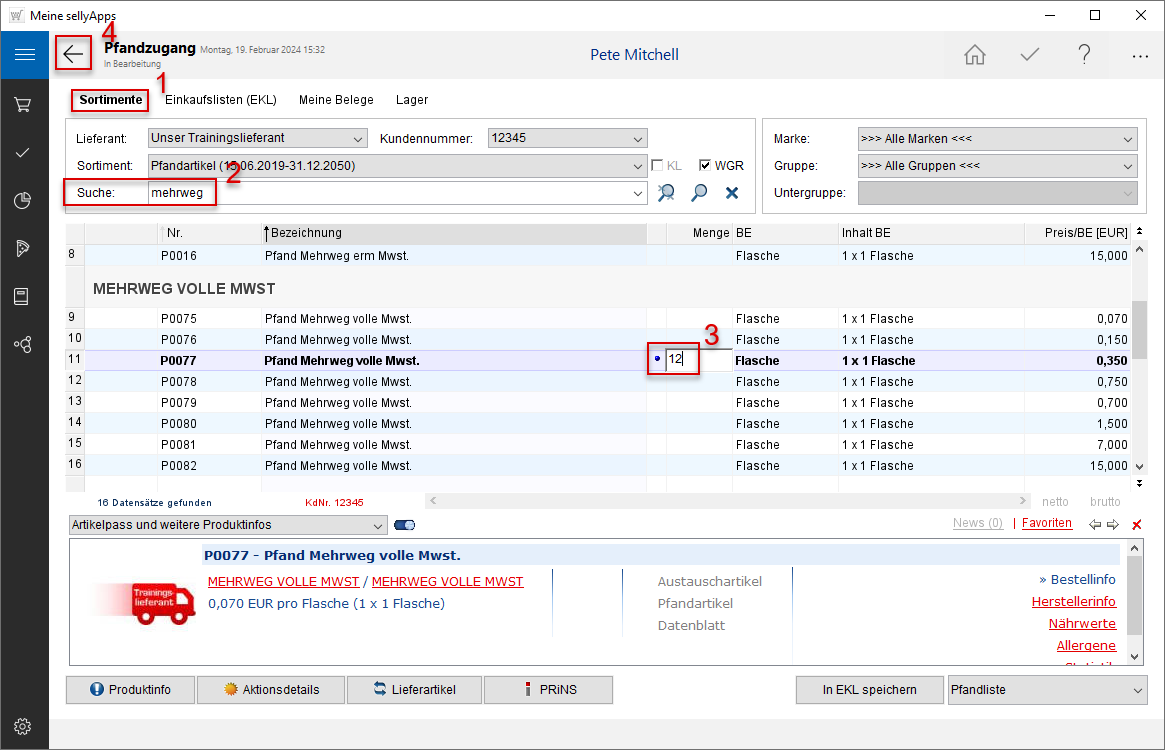 Artikellisten (s. Markierung 1) und sehen das Pfandsortiment