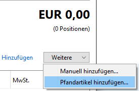 Bei einem Pfandzugang wählen Sie im Menü zwischen den Optionen Pfandartikel hinzufügen... und Manuell hinzufügen... (s. Bild links).