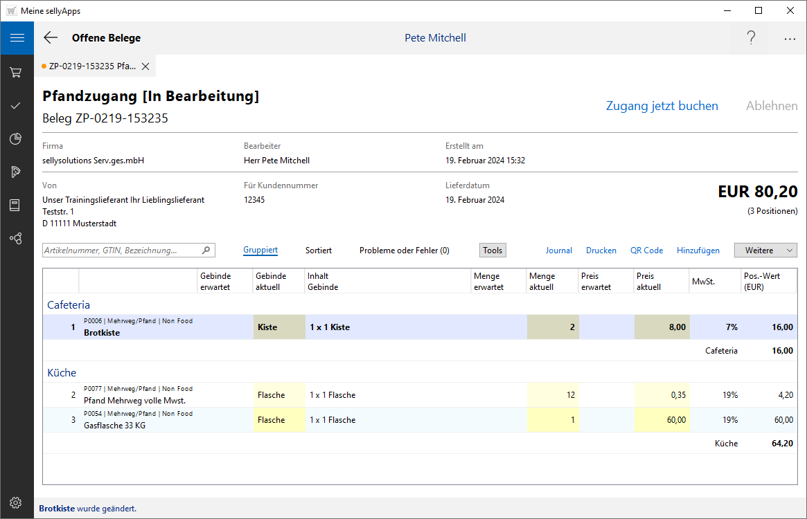 Die aus dem Lieferschein übernommenen Pfanddaten waren korrekt, somit wird an keiner Position ein Fehlerhinweis angezeigt.