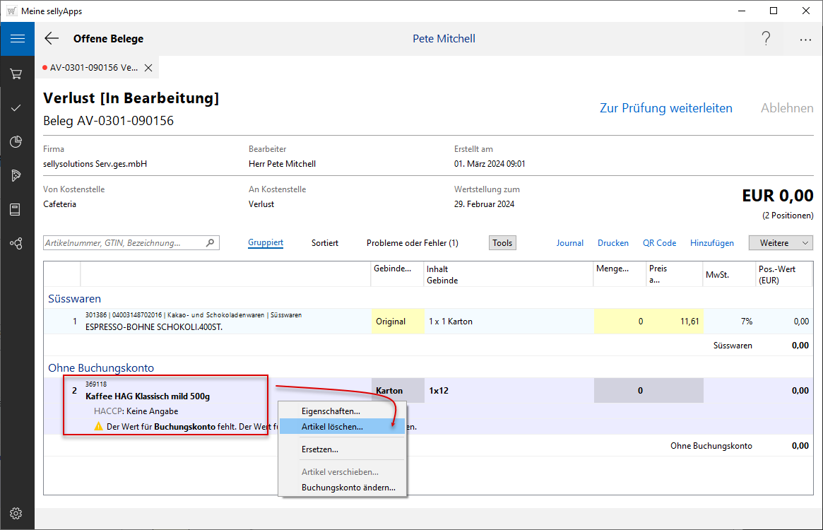 In diesem Abschnitt handelt es sich um das Löschen einer Artikelposition aus einem Verlustbeleg, zur die Buchung eines Verlustes.