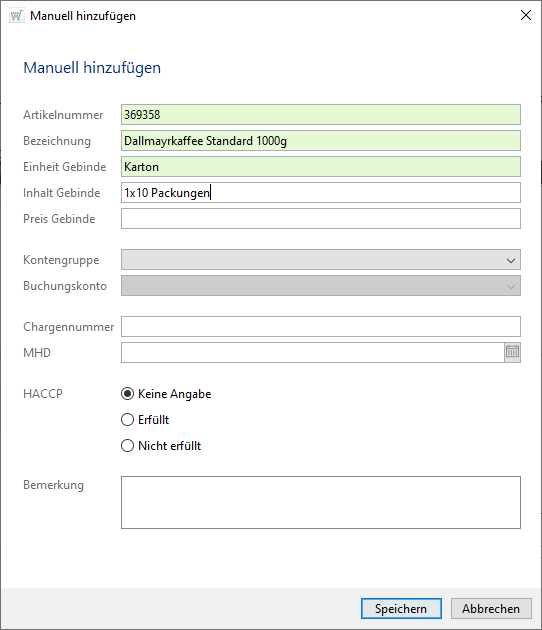 Bei der manuellen Aufnahme von Artikeldaten müssen Sie jeweils die Artikelnummer, die Bezeichnung und die Angabe zur