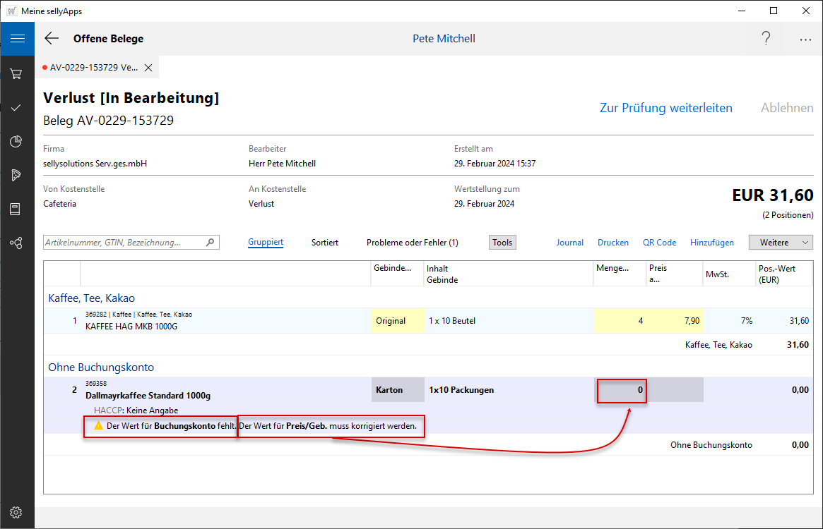 Da ein Verlustbeleg nach Anlage immer zunächst leer ist, müssen Sie die Belegpositionen selbst ergänzen.