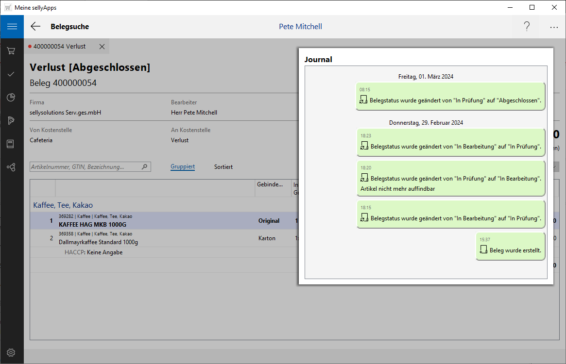 Es werden jeweils die Belegübergänge von Bearbeitung zur Prüfung, von Prüfung zur Bestätigung und letztendlich von der Bestätigung zum Abschluss dokumentiert.
