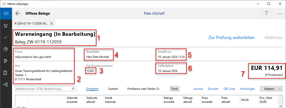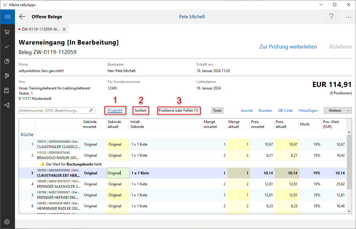 Ist nicht jede Belegposition in allen Daten korrekt oder entspricht die Warenlieferung nicht im Detail der bestellten Ware, nehmen Sie hier die Korrektur vor.
