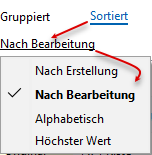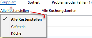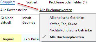 Hilfreich ist auch die Gruppierung (s. o. Markierung 1) nach Kostenstellen oder Buchungskonten (Bildbeispiel s. Bild rechts) bzw. bei einem Inventurvorgang nach Lagerorte und -bereiche. Die Einträge ergeben sich jeweils aus den tatsächlich im Beleg vorhandenen Daten.