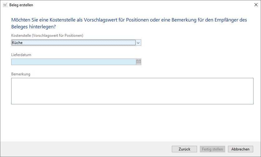 Die Daten des Lieferanten und der verwendeten Kundennummer werden angezeigt und im nächsten Schritt wählen Sie eine Kostenstelle und auch das Lieferdatum. Dazu öffnen Sie den Kalender und wählen das Datum aus (s. Mouseover im Bild rechts). Mit Klick auf die Schaltfläche [Fertig stellen], haben Sie den Beleg erfolgreich angelegt.