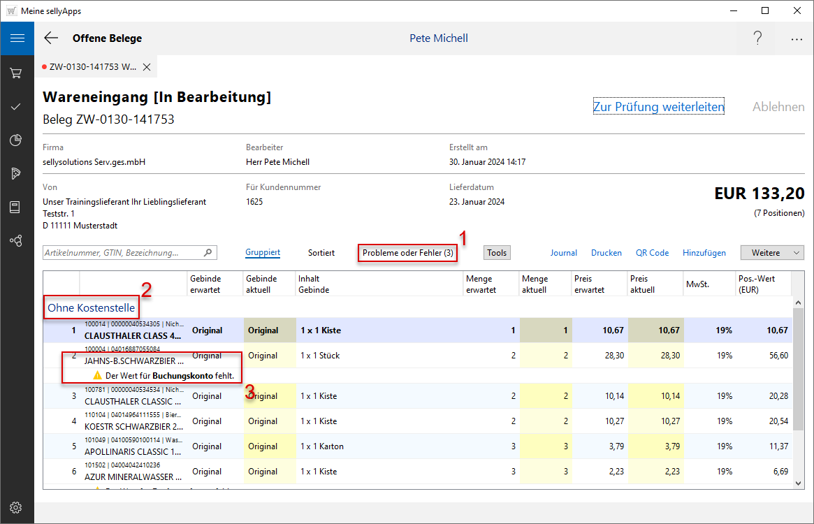 drei Belegpositionen nicht fehlerfrei bzw. bedürfen eine Sichtung, durch den Bearbeiter.
