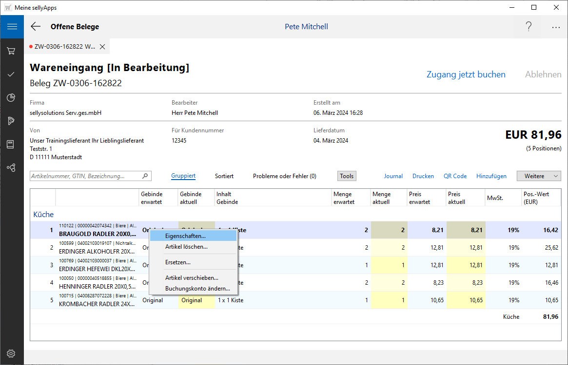 Sollten die Positionseigenschaften nicht korrekt bzw. unvollständig sein, nutzen Sie zur Korrektur den Eigenschaftsdialog Sie öffnen diese Eigenschaften mittels Kontextmenü (rechte Maustaste).