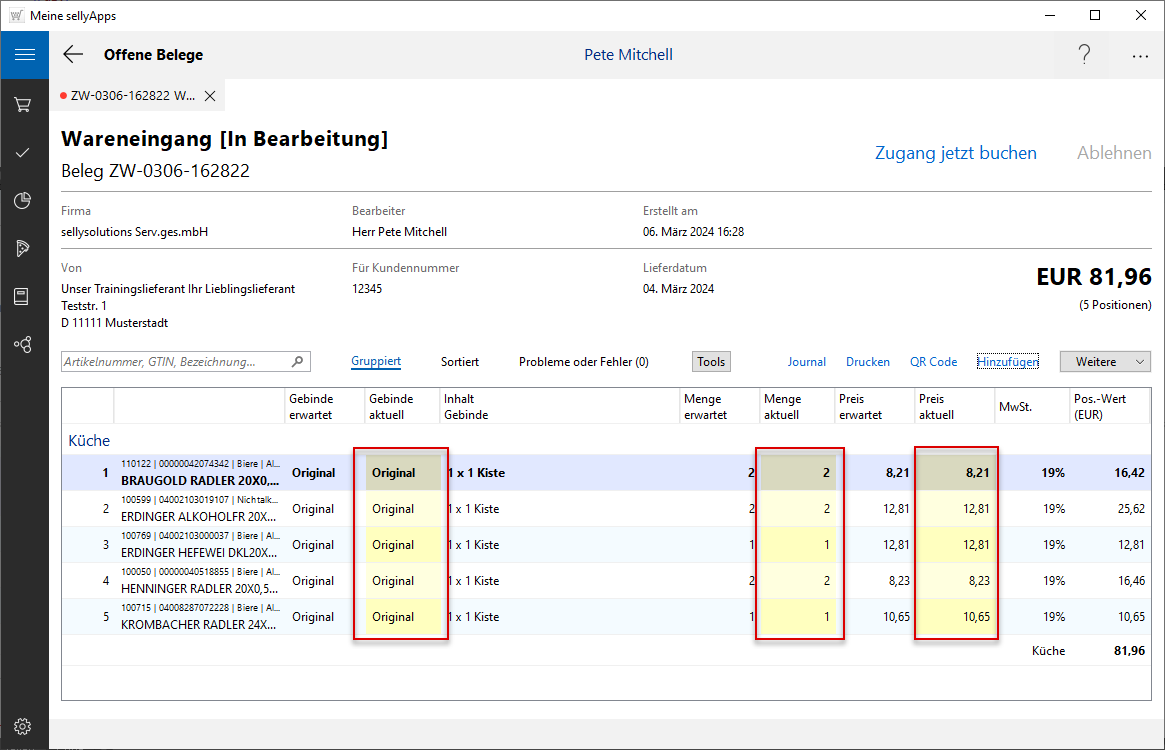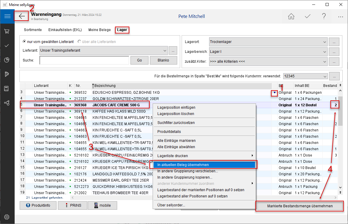 Zur Übernahme der Artikel in Ihren Beleg markieren Sie den oder die Artikel in der Tabelle (s. Markierung 3) und übernehmen den oder die Artikel mittels rechtem Mausmenü bzw. nutzen die die Schaltfläche [Markierte