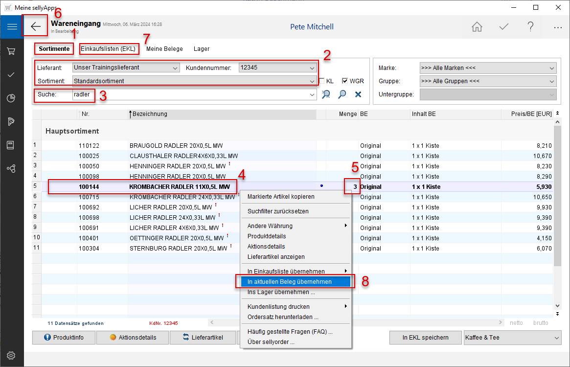 (s. Markierung 4). Ggfs. führen Sie einen Suchvorgang durch, um den Artikel zu finden