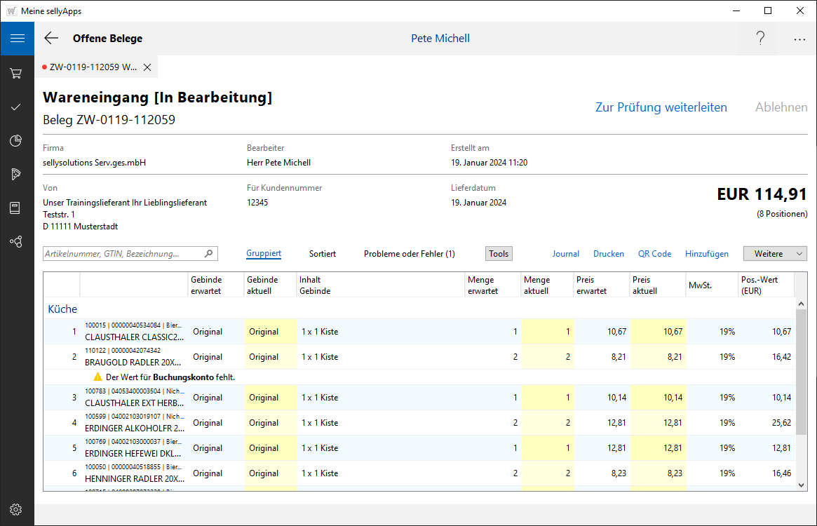 Die vom Lieferschein übernommenen Artikel sind jetzt im Beleg aufgelistet. Im oberen Bereich sehen Sie die Kopfdaten.