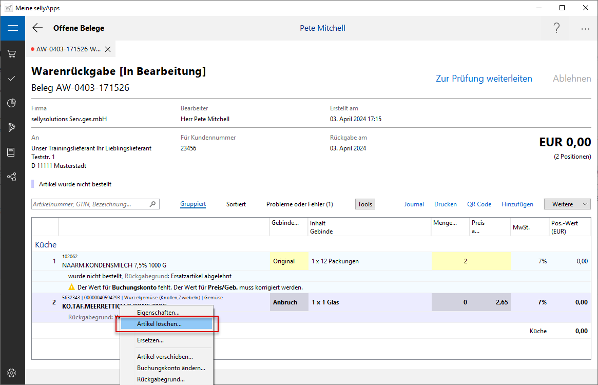 Beantworten Sie die Systemnachfrage mit Klick auf die Schaltfläche [Jetzt löschen], wird die Position aus dem Beleg gelöscht.