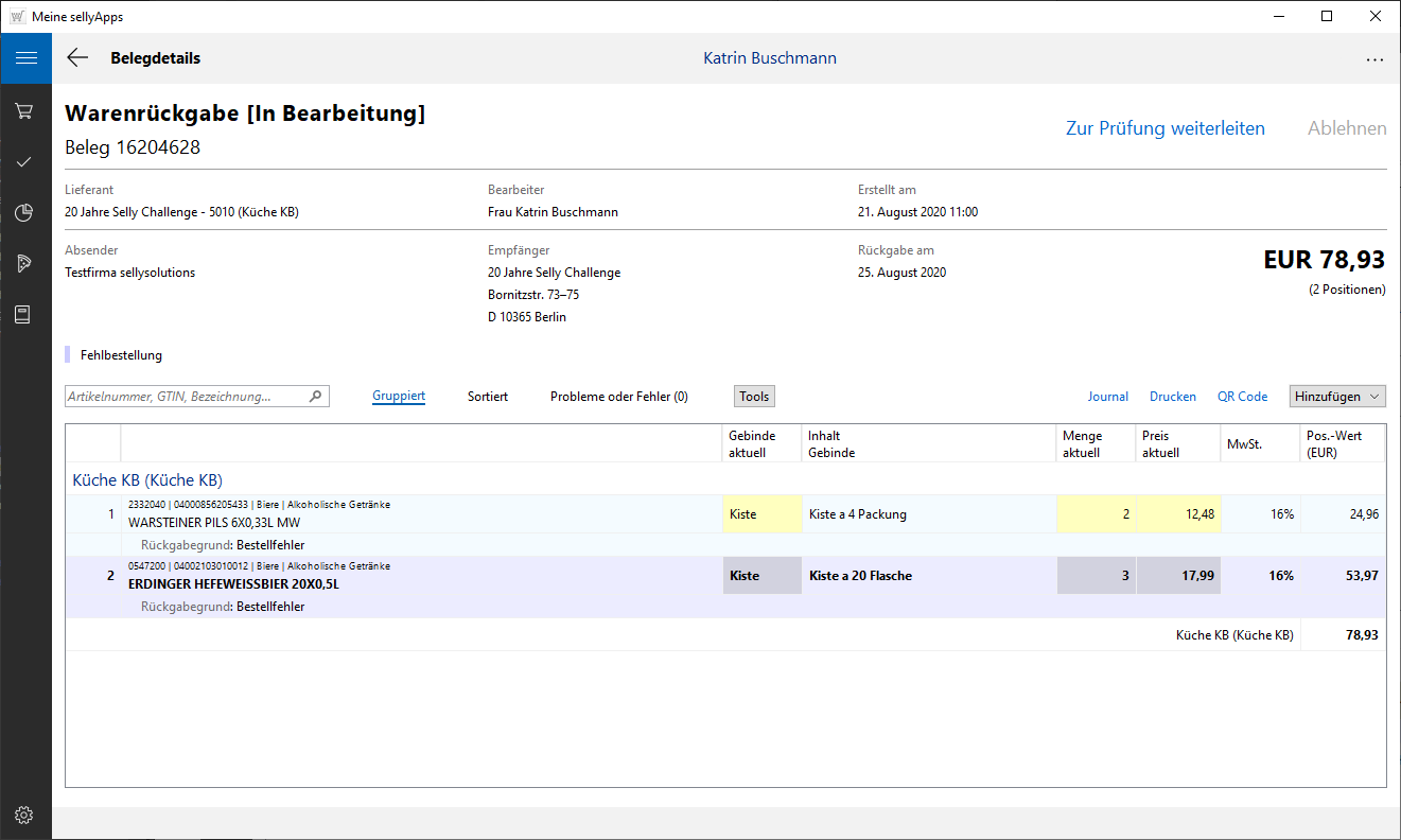 In den sellyApps, im Bereich Warenbewegungen, können Sie einen Beleg für eine Warenrückgabe erstellen und verbuchen.