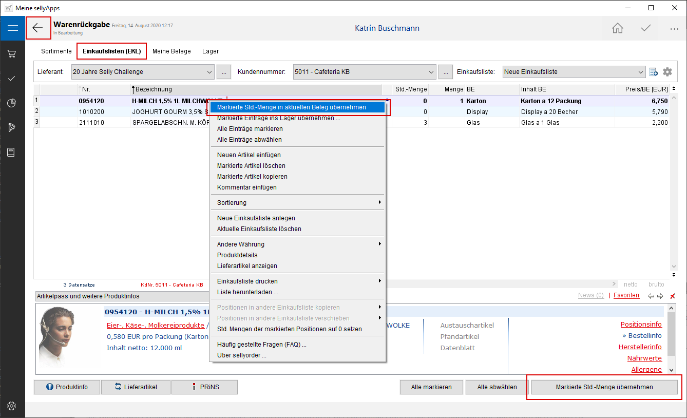 (Einkaufsliste, Meine Belege, Lager, s. Markierung 6) aus, geben die Menge ein oder nutzen die Übernahmeschaltflächen