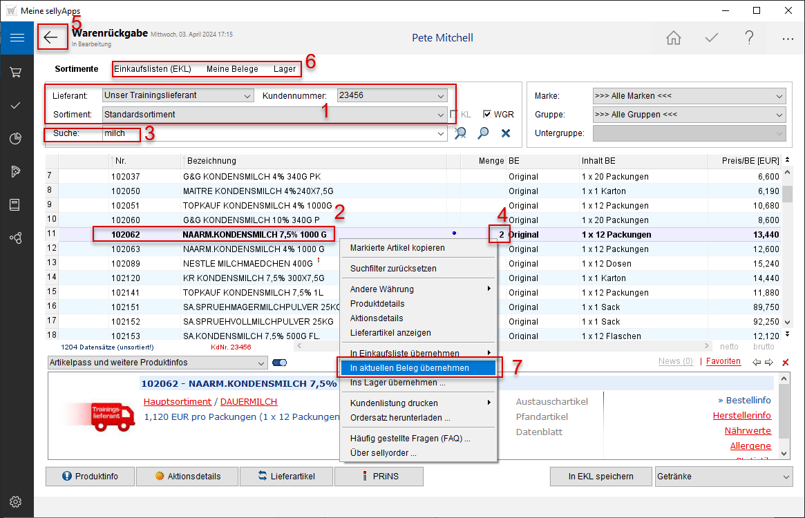 Sortiment (s. Markierung 1) und markieren die oder den Artikel, den Sie in Ihren Beleg übernehmen möchten (s. Markierung