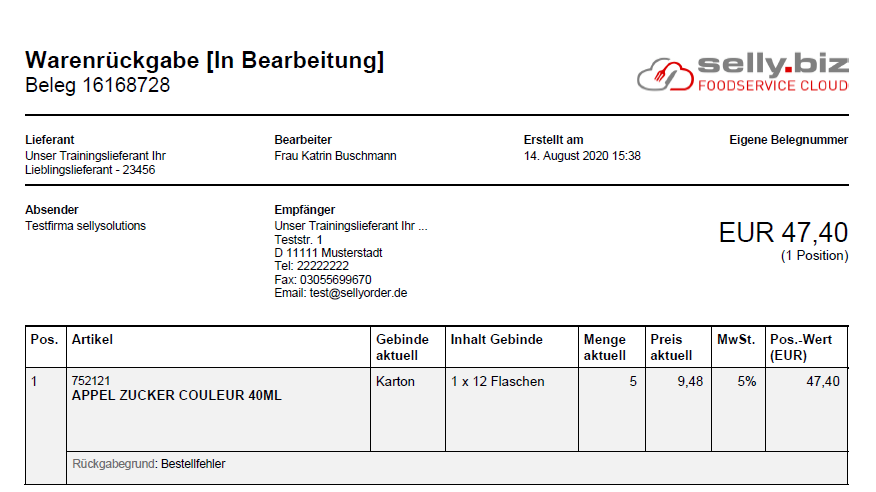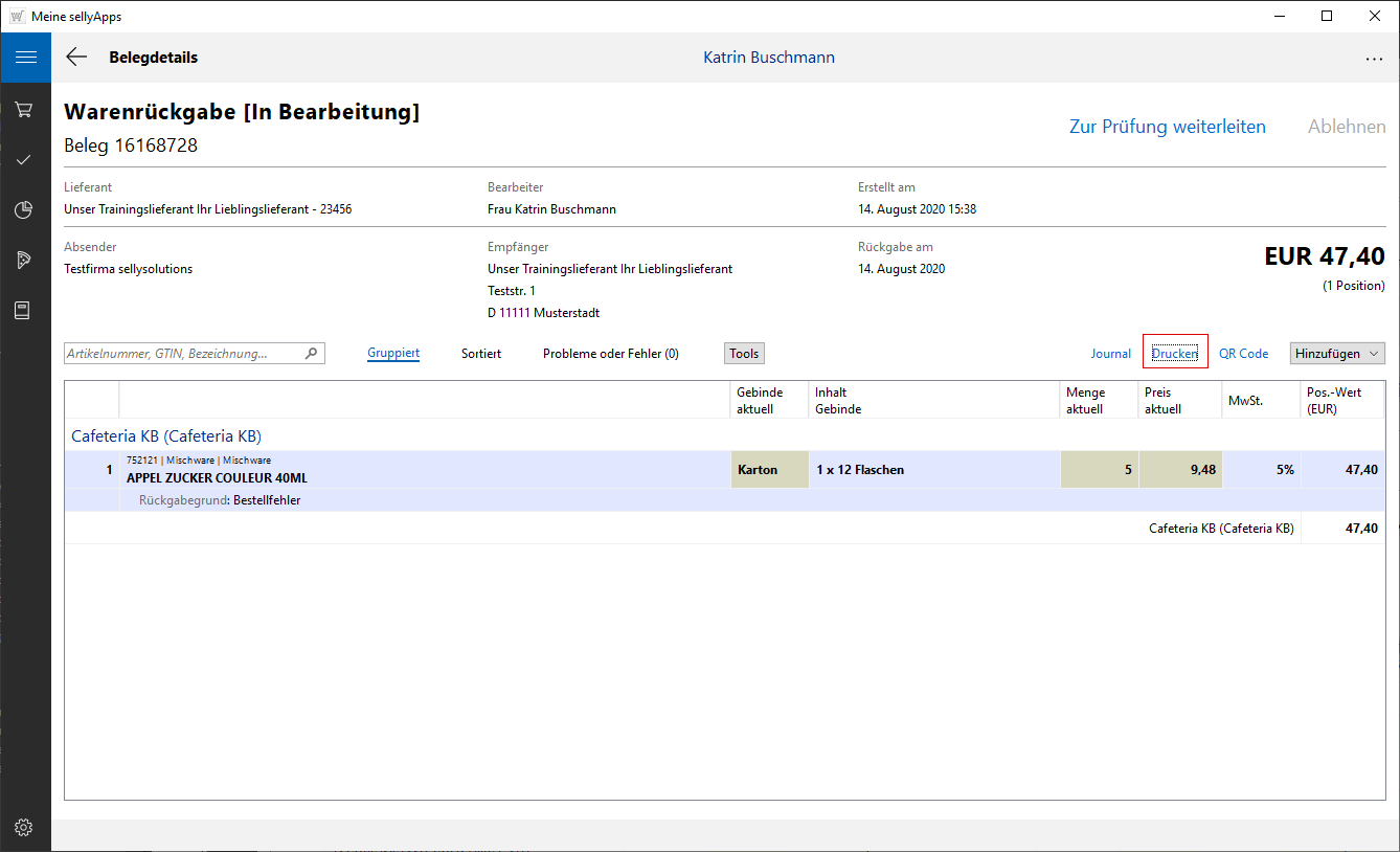 In dieser Ansicht können Sie Ihren Beleg für eine Warenrückgabe ausdrucken.