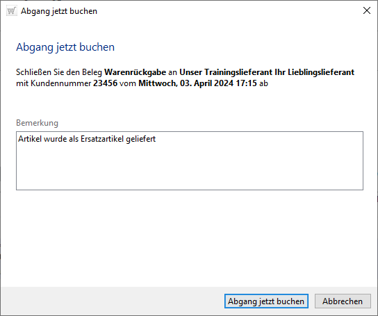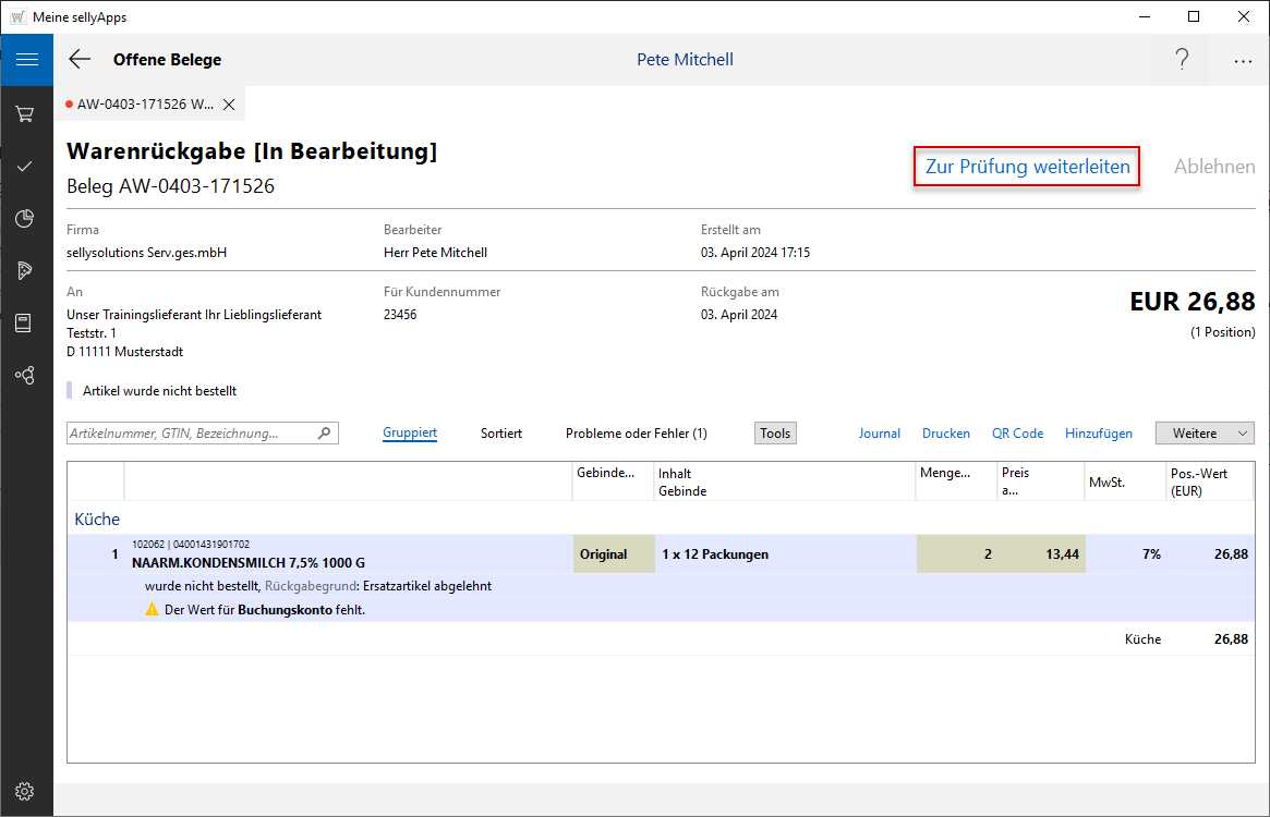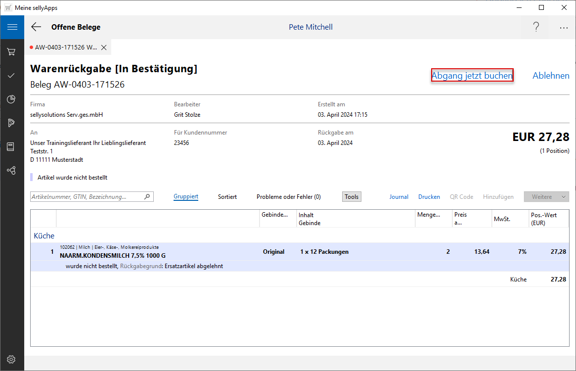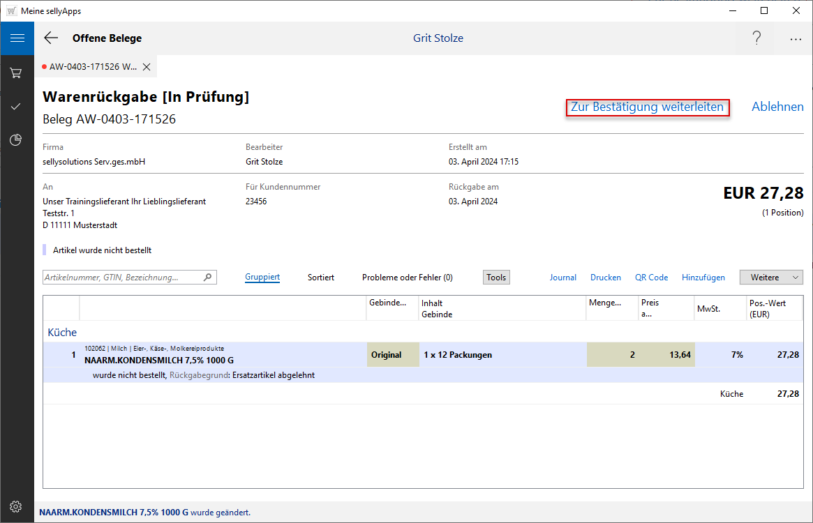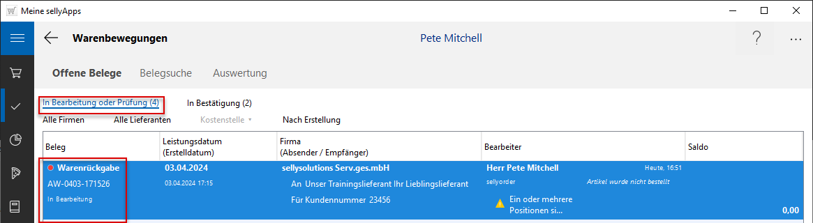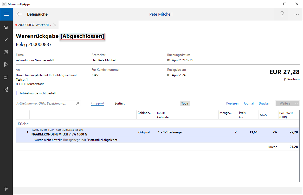 öffnen Sie den Warenrückgabebeleg und sehen, dass dieser jetzt im Status Abgeschlossen