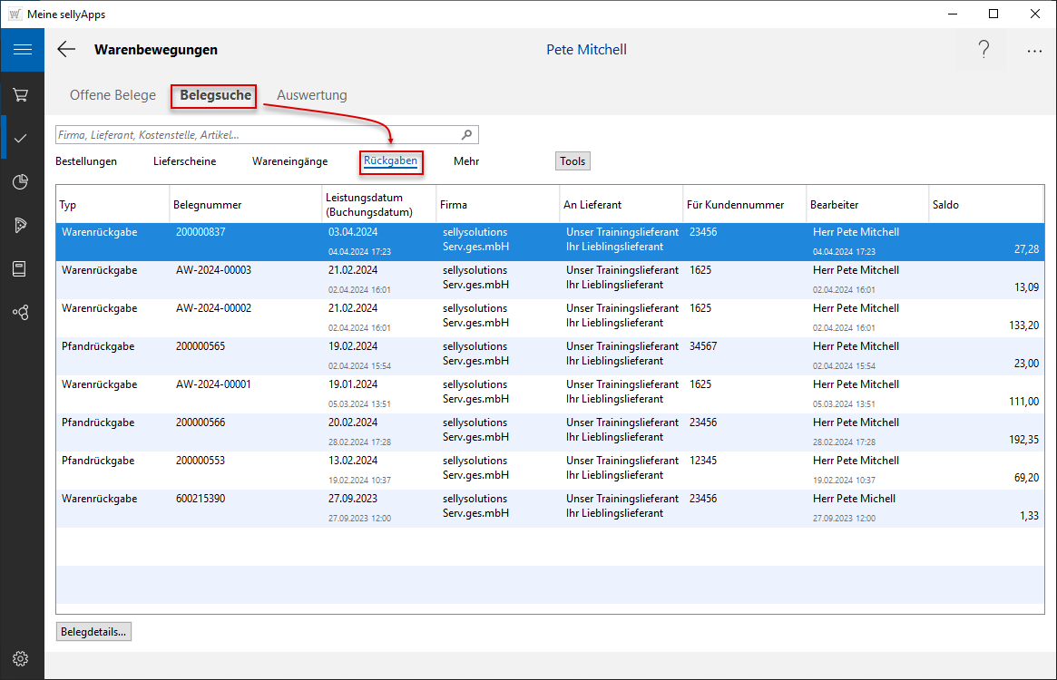 Der abgeschlossene Beleg ist jetzt in der Belegsuche (Belegarchiv) zu finden. Der Aufruf bzw. die Ansicht des Warenrückgabebeleges erfolgt nun über den Funktionslink Rückgaben und hat jetzt der Status Abgeschlossen.