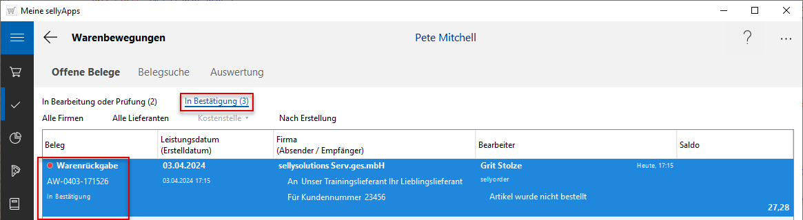 Der bestätigte Beleg ist nun in der Liste In Bestätigung und hat ebenfalls den Status In Bestätigung.