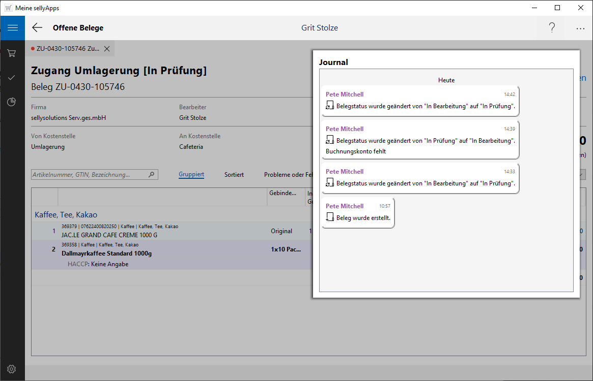 Für jeden erzeugten Beleg hinsichtlich Warenbewegungen in den sellyApps, werden wichtige Belegänderungen im Journal dokumentiert.