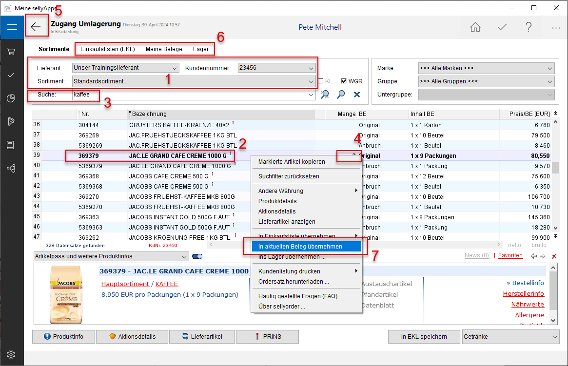 Sortiment (s. Markierung 1) und markieren die oder den Artikel, den Sie in Ihren Beleg übernehmen möchten (s. Markierung