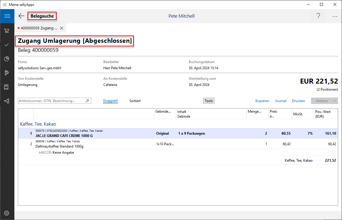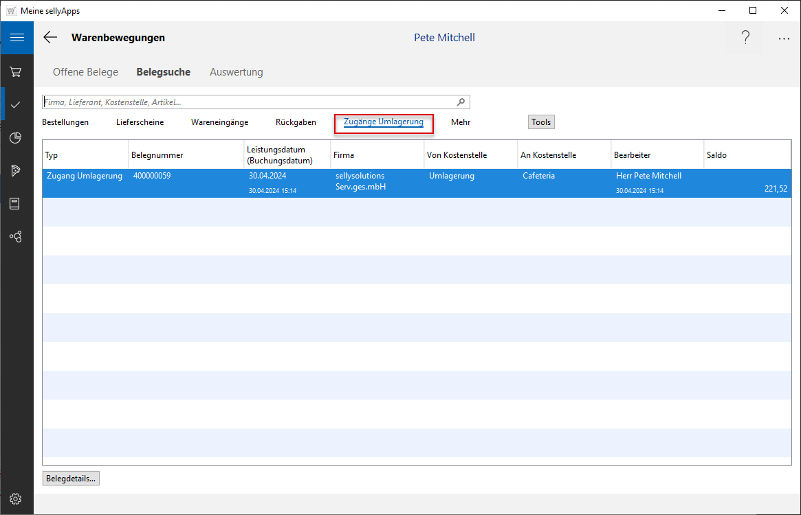 Jeder abgeschlossene Beleg ist in der Belegsuche, das im WWS hinterlegte Belegarchiv zu finden, so auch Ihr Umlagerungsbeleg.