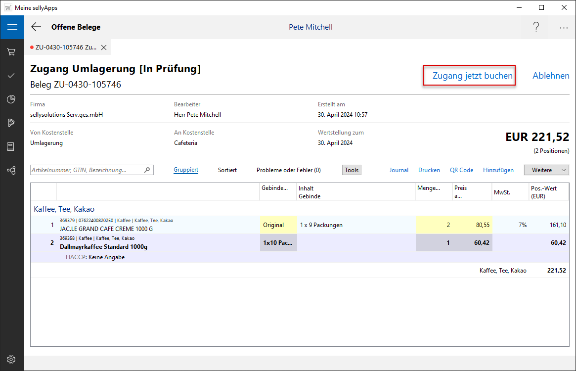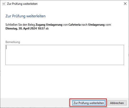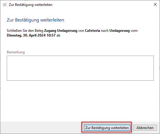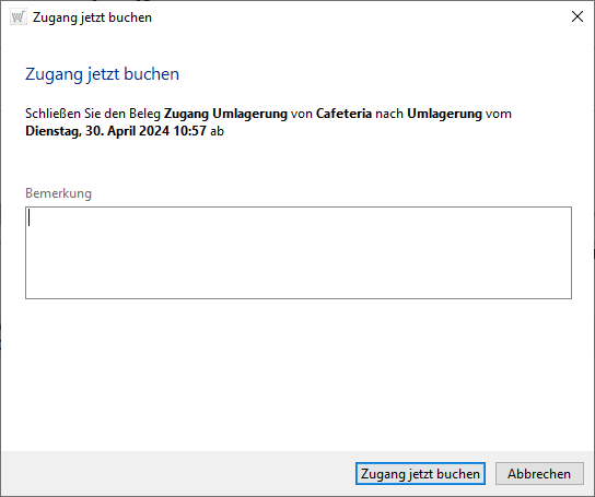 Mit einem letzten Klick auf [Zugang jetzt buchen] schließen Sie den Buchungsvorgang Ihres Umlagerungsbeleges ab.