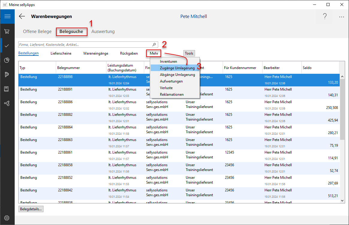 Zum Aufruf bzw. Ansicht nutzen Sie den Funktionslink Belegsuche (s. l. Markierung 1), wählen aus dem Menü Mehr (s. l. Markierung 2) die Belegkategorie Abgänge Umlagerung (s. l. Markierung 3).