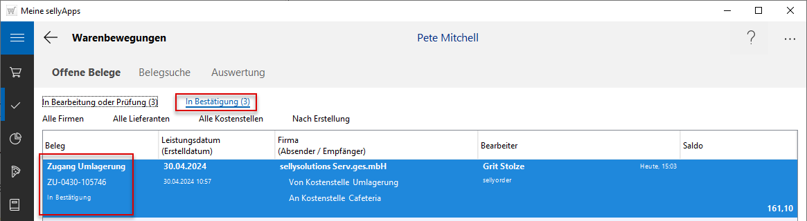 Der bestätigte Beleg ist nun in der Liste In Bestätigung und hat ebenfalls den Status In Bestätigung.