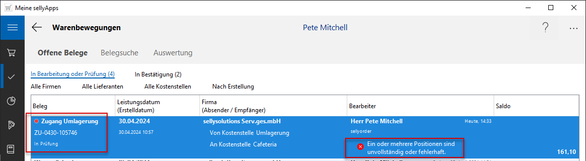 Der Beleg verbleibt auch nach Weiterleitung in der Liste In Bearbeitung und Prüfung, wird jetzt aber mit dem Status In Prüfung gekennzeichnet. Sie müssen für diesen Artikel eine entsprechende Korrektur vornehmen.