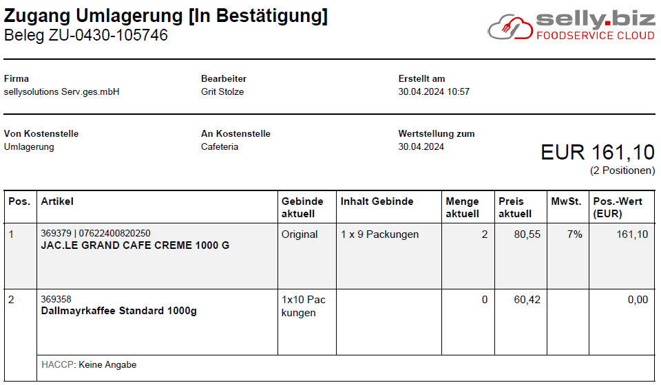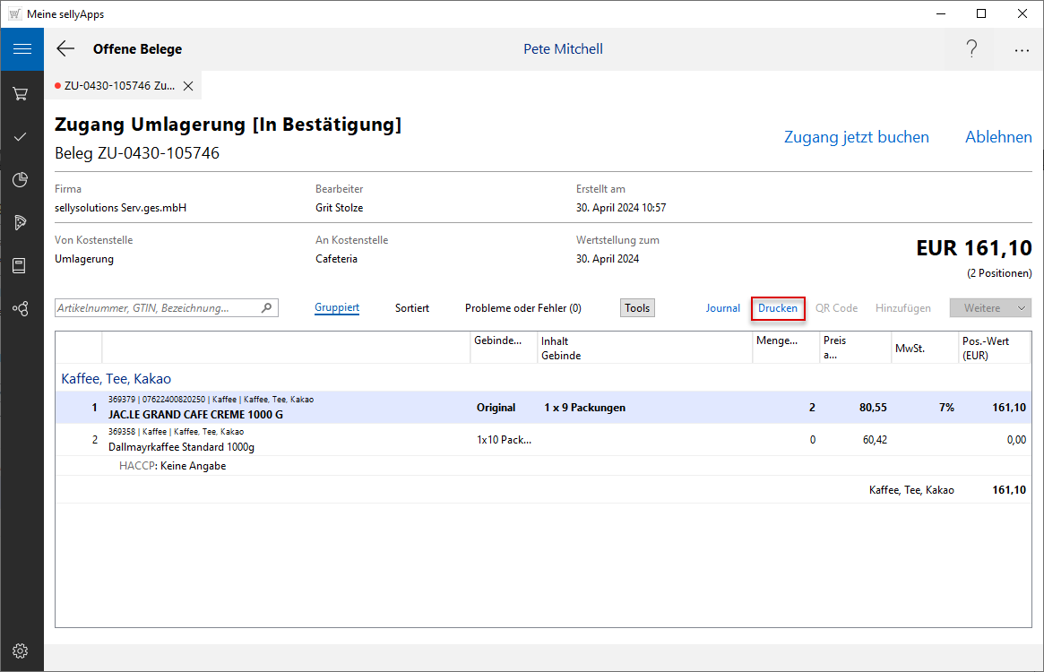 Alle Ihre erzeugten Belege über Warenbewegungen können Sie ausdrucken. Sie öffnen dazu Ihren Beleg in der Detailansicht und nutzen da die