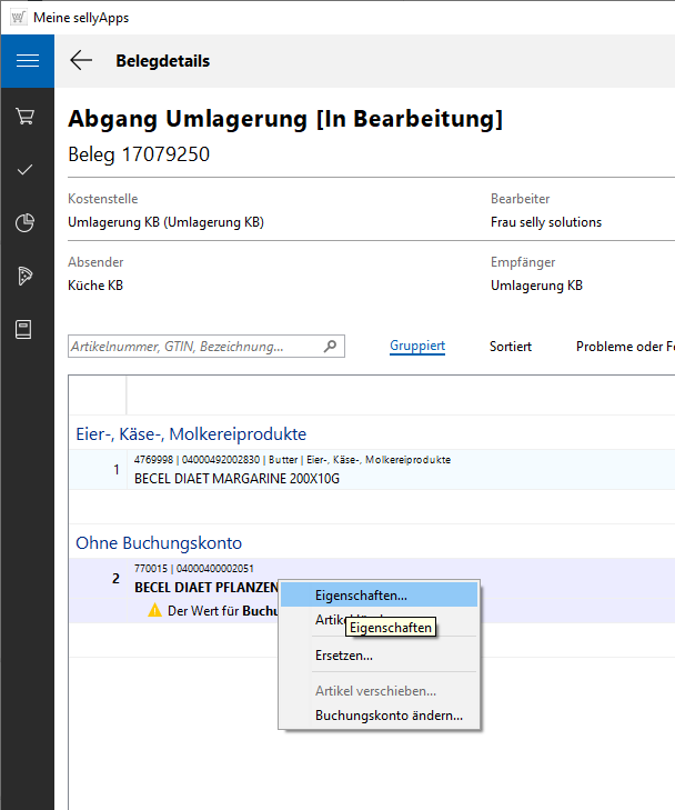 Um eine Kontengruppe bzw. Kostenstelle zu wählen, die Chargennummer oder MHD zu hinterlegen bzw. eine zutreffende HACCP-Angabe zu wählen oder eine Bemerkung einzutragen, nutzen Sie ebenfalls das Kontextmenü der rechten Maustaste.